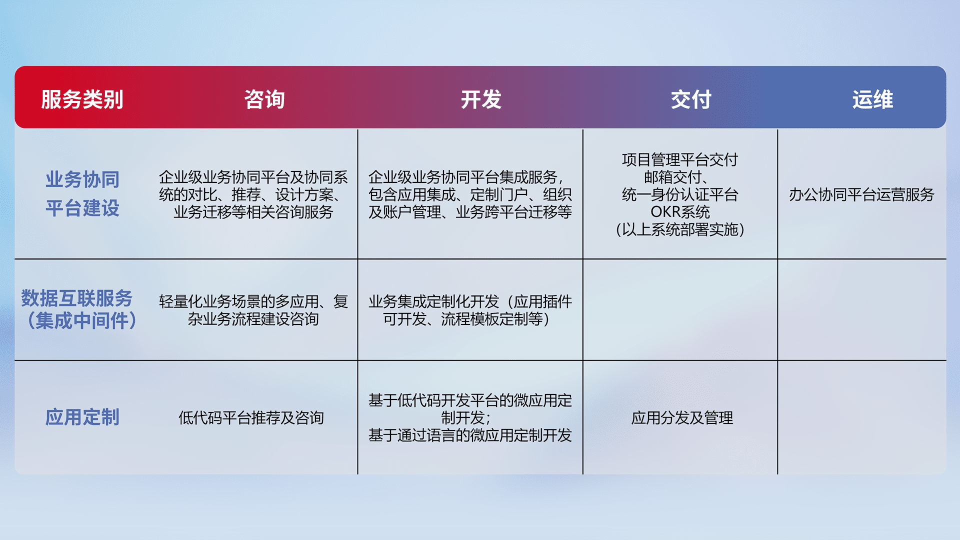 针对钉钉、、、企微、、、、IDaas等平台级产品提供产品的规划、、、、方案、、、、交付、、定制化开发等服务,,实现如统一协同办公、、、、智能客户服务、、、混合会议管理、、、智能数据查询、、、等业务场景,,,实现数字化转型。。